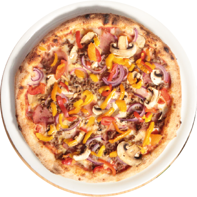 Tomate, fromage, boeuf épicé, oignons, champignons, poivrons, jambon